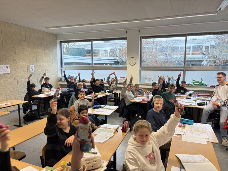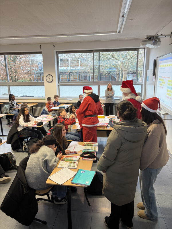 Bis zur 4. Stunde war der Weihnachtsmann, überzeugend gespielt von Yunus und Bardia, in allen Klassen gewesen und hatte mit Hilfe seiner Begleitung allen Schülerinnen und Schülern sowie den Lehrkräften einen Schokoladennikolaus geschenkt. Damit lösten sie viele lächelnde Gesichter aus.