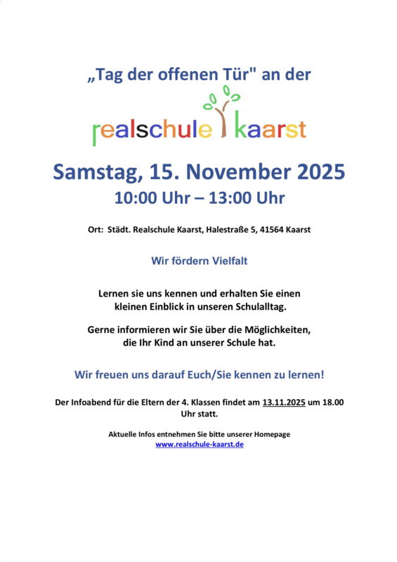Am 15. November 2025 lädt die Realschule Kaarst herzlich alle Grundschüler der 4. Klasse und deren Eltern zum Tag der offenen Tür ein. Von 10:00 bis 13:00 Uhr haben Sie die Möglichkeit, unsere Realschule, das Fachangebot, das Schulprogramm und das pädagogische Team näher kennenzulernen.