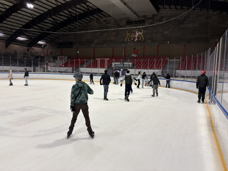 Nach der Ankunft in der Eishalle erhielten die Schülerinnen und Schüler zunächst ihre Schlittschuhe und konnten sich anschließend auf der Eisfläche ausprobieren. Während einige bereits sicher ihre Runden drehten, wagten andere ihre ersten Schritte auf dem Eis.