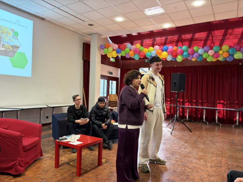 Liam und Azhy aus dem Kernteam des Schülerrates hatten die gesammelten Fragen der Schülerinnen und Schüler für ihre Moderation vorbereitet und gaben der Veranstaltung einen gelungenen Rahmen.