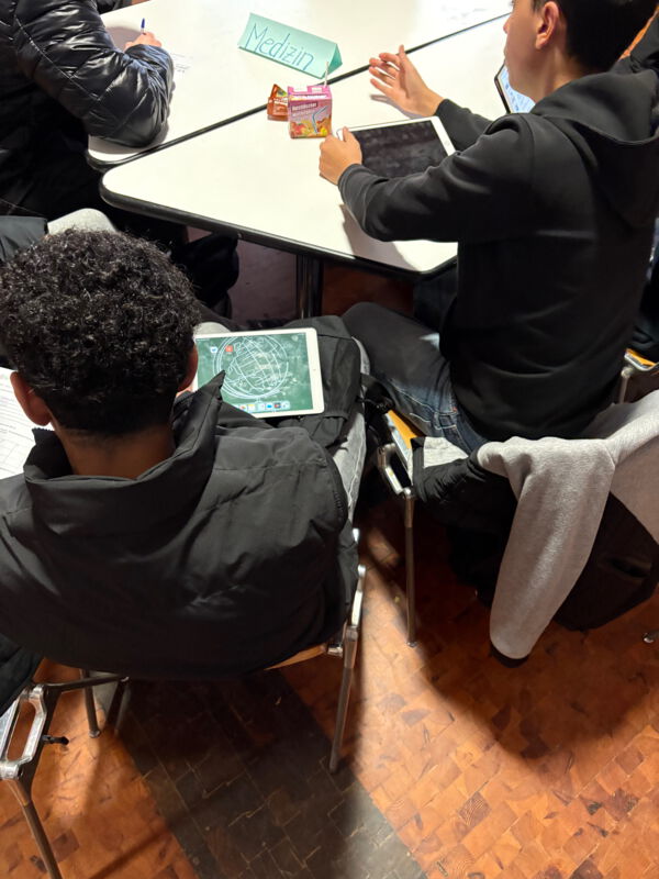 Matin gibt an eine Gruppe Jungs der Klasse 9C weiter, dass man für die Arbeit in der