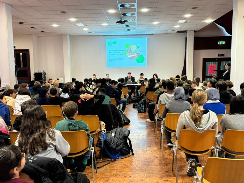 Direkt nach den Herbstferien lud die Schülervertretung alle Jahrgangsstufen ins Forum zur ersten Schulversammlung ein. Um die 410 Schülerinnen und Schüler umfassend über die anstehenden Aktionen der SV in diesem Schuljahr informieren zu können, hatten Schülersprecher Azhy, seine Stellvertreterin Tala und die Mitglieder des SV-Kernteams Liam, Deniz, Yunus und Filip nach Jahrgangsstufen gestaffelt eingeladen.