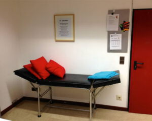 Im erst kürzlich sanierten SAN-Raum lagern mit Ausnahme des AEDs alle oben genannten Ausrüstungsgegenstände. Zusätzlich befinden sich hier eine Liege, ein Kühlschrank mit Kühlpacks, ein Schreibtisch, ein Gruppentisch und vier Stühle. Verletzte oder Kranke können hier in einer angenehmen Atmosphäre betreut und behandelt werden. Neben den Materialien zur Wundversorgung befinden sich hier ebenfalls Decken. In den Schränken lagern Verbrauchsmaterialien. Zur Hygiene stehen ein Waschbecken mit Seife, Papierhandtücher und ein Desinfektionsmittelspender zur Händedesinfektion zur Verfügung.